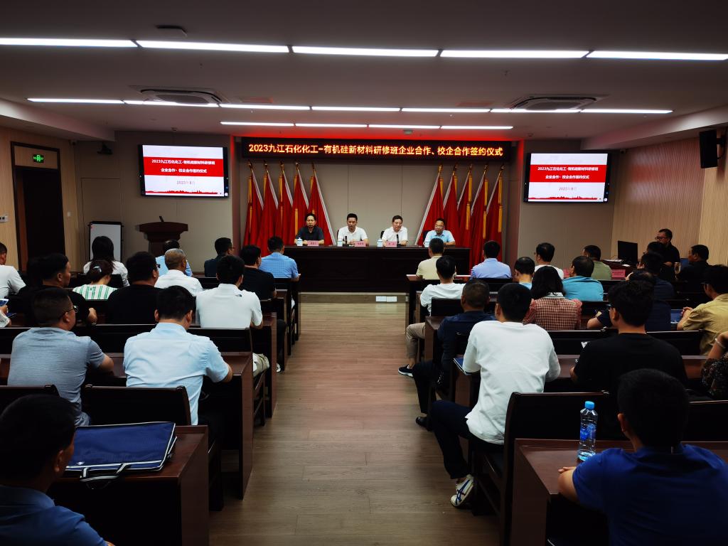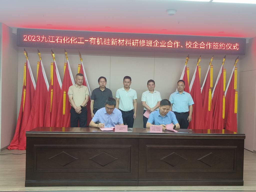 8月30日下午5时30分,在欢快的音乐声中,江西贝特利新材料有限公司总经理欧阳旭频和湖北硅元新材料科技有限公司总经理刘裴,东方巨龙化工有限公司总经理周建龙和江西理文化工有限公司副总经理黄绍威,米兰milan官方网站化学化工学院副院长占昌朝和九江九宏新材料有限公司周巧荣,先后上台签订意向性企业合作和校企合作协议。据悉,这是2023年全市石化化工-有机硅新材料产业链高层管理人员专业化能力研修班为学员临时安排的一个仪式。九江市政府副秘书长徐松茂、九江市工信局党委书记、局长娄琦,九江市产业升级促进中心主任傅建文、米兰milan官方网站院长郑祚双及研修班全体学员共同见证了这一特殊时刻。