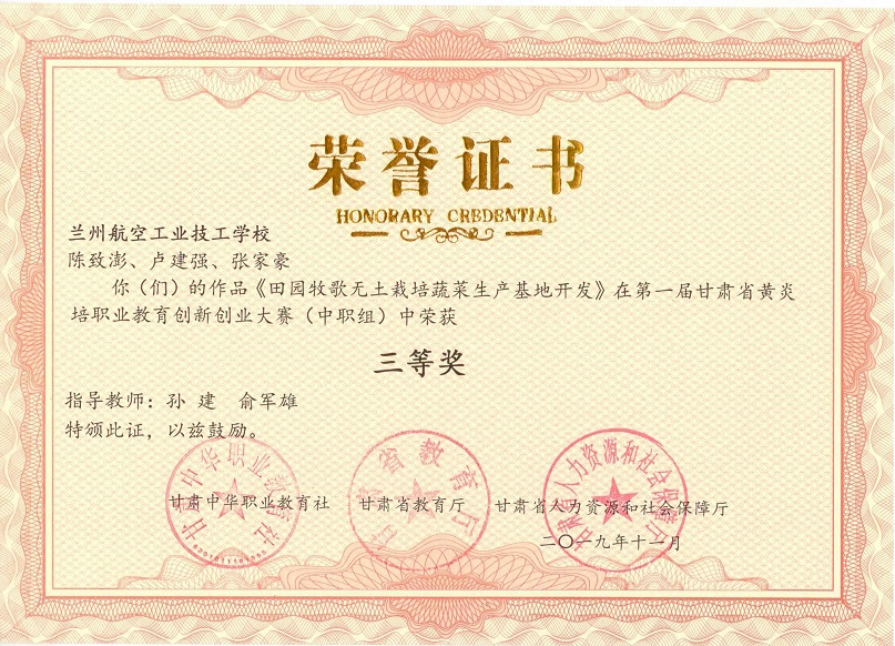 2019 年11月8日,第一届甘肃省黄炎培职业教育创新创业大赛在兰州资源环境职业技术学院举行,经过的激烈角逐,兰州航空工业职工大学报送的项目《保家净智能垃圾桶》荣获高职组三等奖,兰州航空工业技工学校报送的项目《田园牧歌无土栽培蔬菜生产基地开发》和《净化清洁服务-垃圾分类代收》荣获中职组三等奖,同时兰州航空工业技工学校获得“优秀组织奖”荣誉。