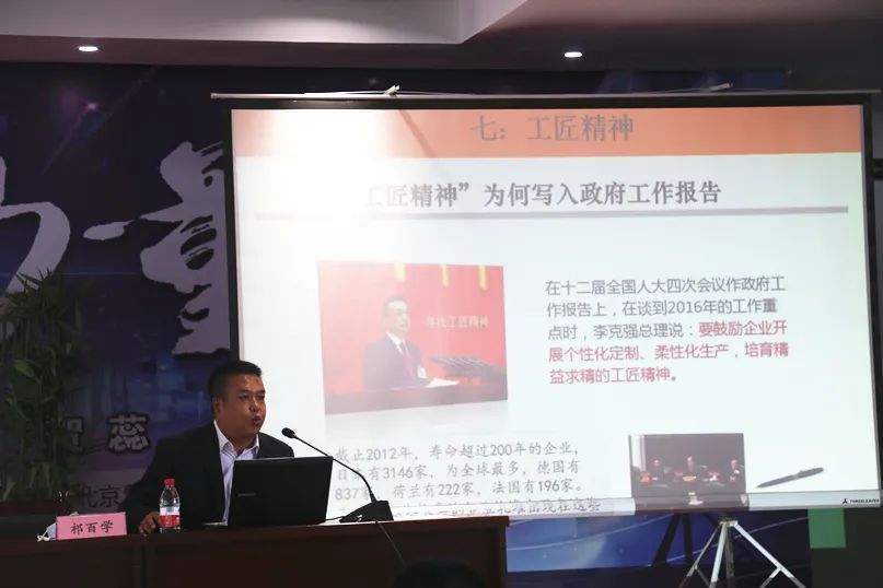 学校实践教学中心主任、甘肃省祁百学技能大师工作室负责人祁百学为同学们讲授了题为《弘扬工匠精神,技能成就梦想》的第一课。他向大家介绍了技能大赛和世界技能大赛,为大家分析了什么是工匠精神。他号召大家认真学习,苦练技能,踏实做事,立志成才,培养“敬”“严”“专”“精”的工作作风,争做“大国工匠”。