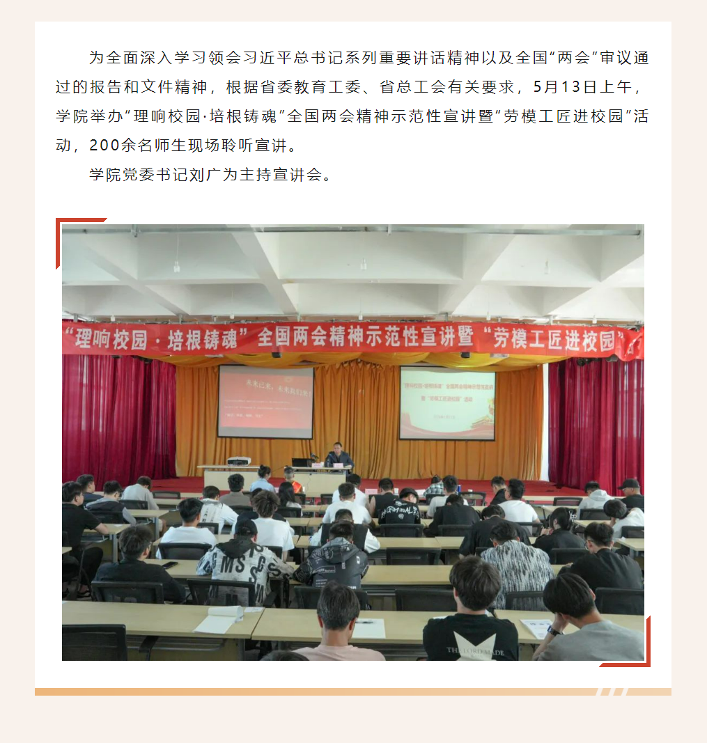 学院举办“理响校园·培根铸魂”全国两会精神示范性宣讲暨“劳模工匠进校园”活动