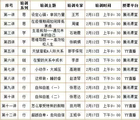 全校各部门、全体师生员工:ihLbeat365官方网站 为深入贯彻落实习近平总书记关于打赢疫情防控阻击战重要指示精神,根据上级部门有关工作部署,进一步做好学校疫情防控工作,学生疫情防控领导小组决定,做好疫情特殊时期“停课不停教,停课不停学”工作,组织全校学生开展“从‘心’出发、为抗‘疫’护航”网络特别主题学习活动。现就有关事项通知如下:ihLbeat365官方网站 一、学习主题ihLbeat365官方网站 从“心”出发、为抗“疫”护航ihLbeat365官方网站 二、学习安排ihLbeat365官方网站 学习时间:2月11日至2月17日ihLbeat365官方网站 学习地址:腾讯课堂直播链接:https://dwz.cn/eOBa9raJihLbeat365官方网站 YY平台直播链接:https://dwz.cn/OXHp22zZ