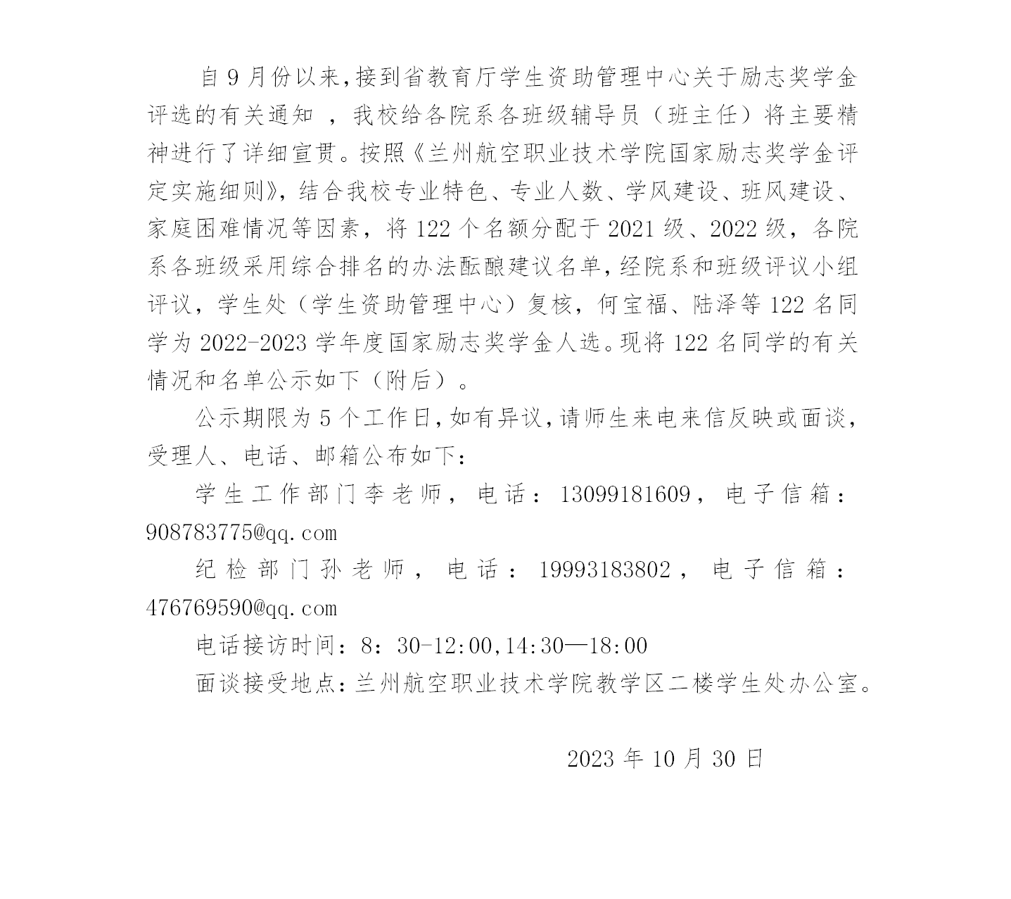2023年国家励志奖学金名单公示