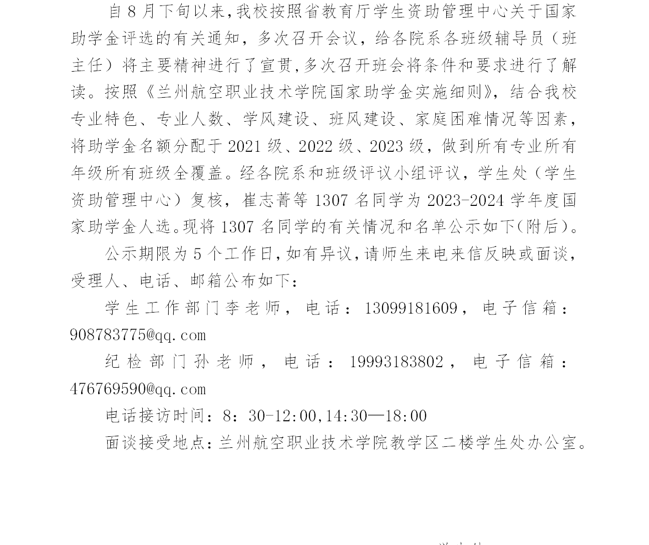 2023-2024学年度国家助学金名单公示