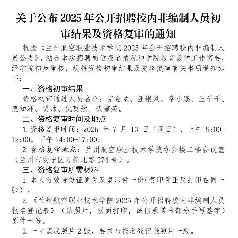 关于公布2025年公开招聘校内非编制人员初审结果及资格复审的通知