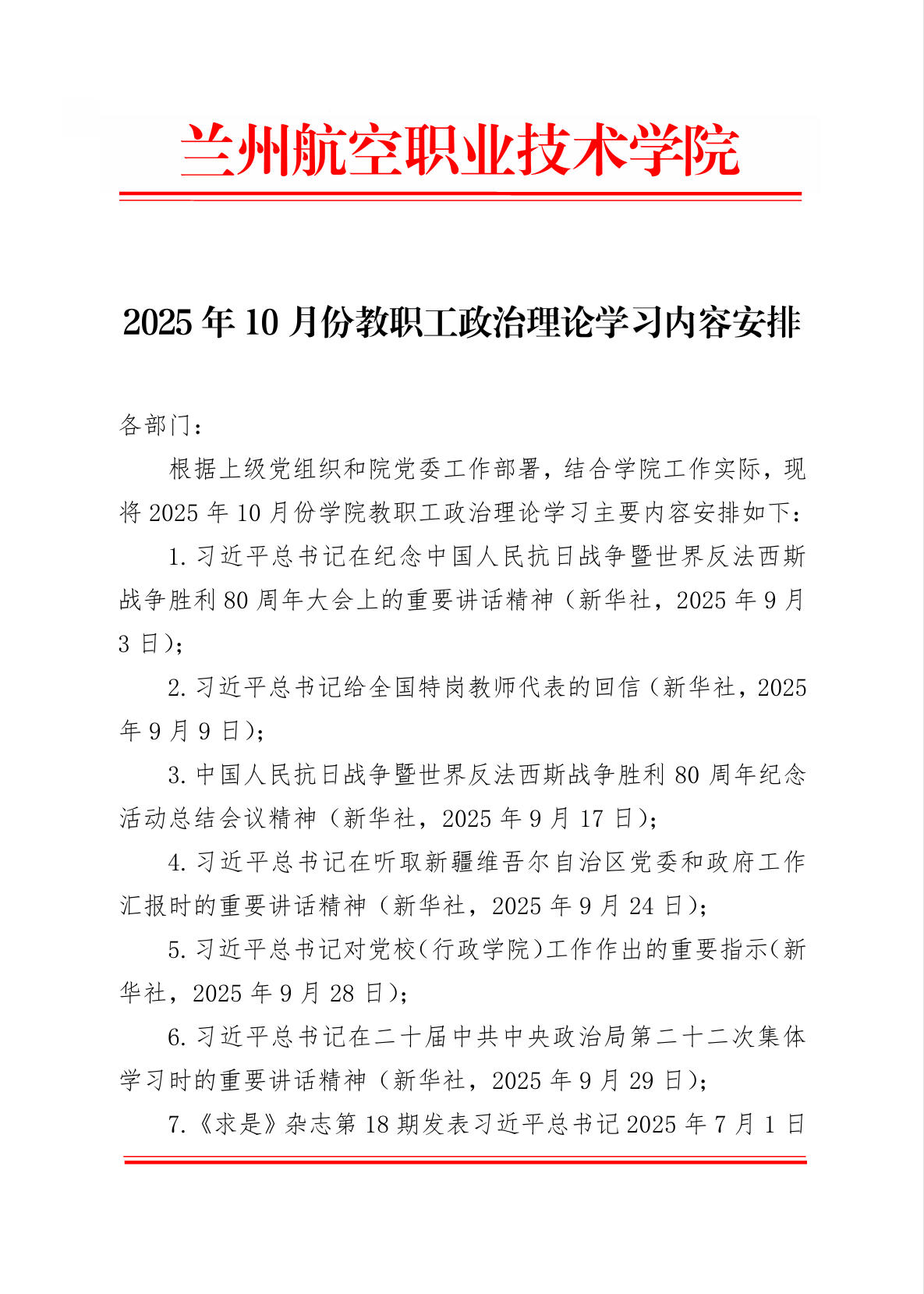 2025年10月份教职工政治理论学习内容安排